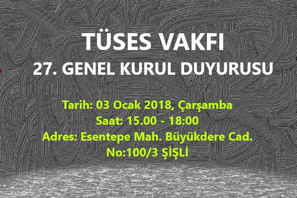 Vakfımızın 27. Genel Kurulu aşağıdaki gündemle çoğunluklu olarak 18 Aralık 2017 pazartesi günü 15.00-18.00 saatleri arasında, çoğunluk sağlanamadığı takdirde 03 Ocak Carşamba günü 15.00-18.00 saatleri arasında Esentepe Mah. Büyükdere Cad. No:100/3 ŞİŞLİ adresinde yapılacaktır.